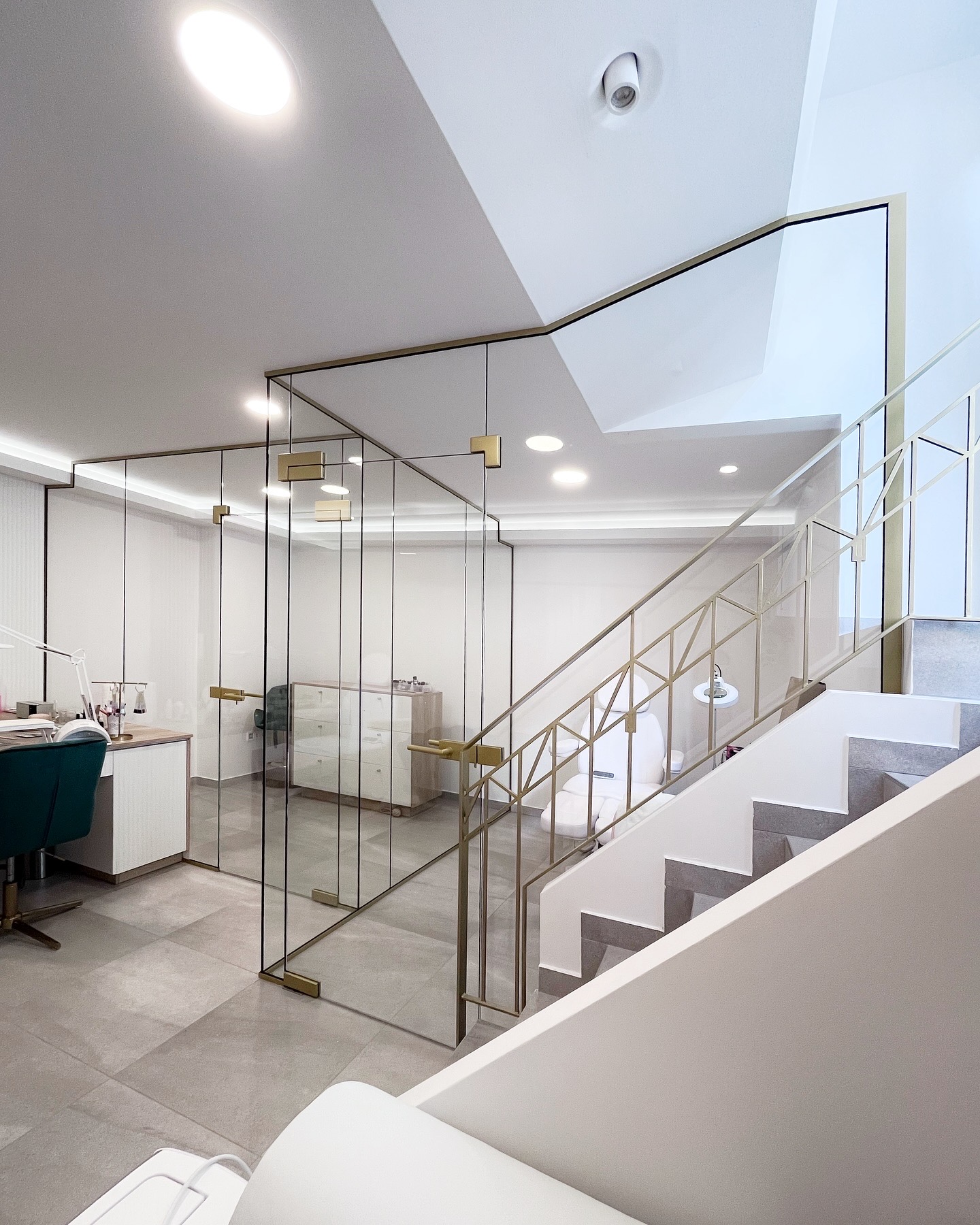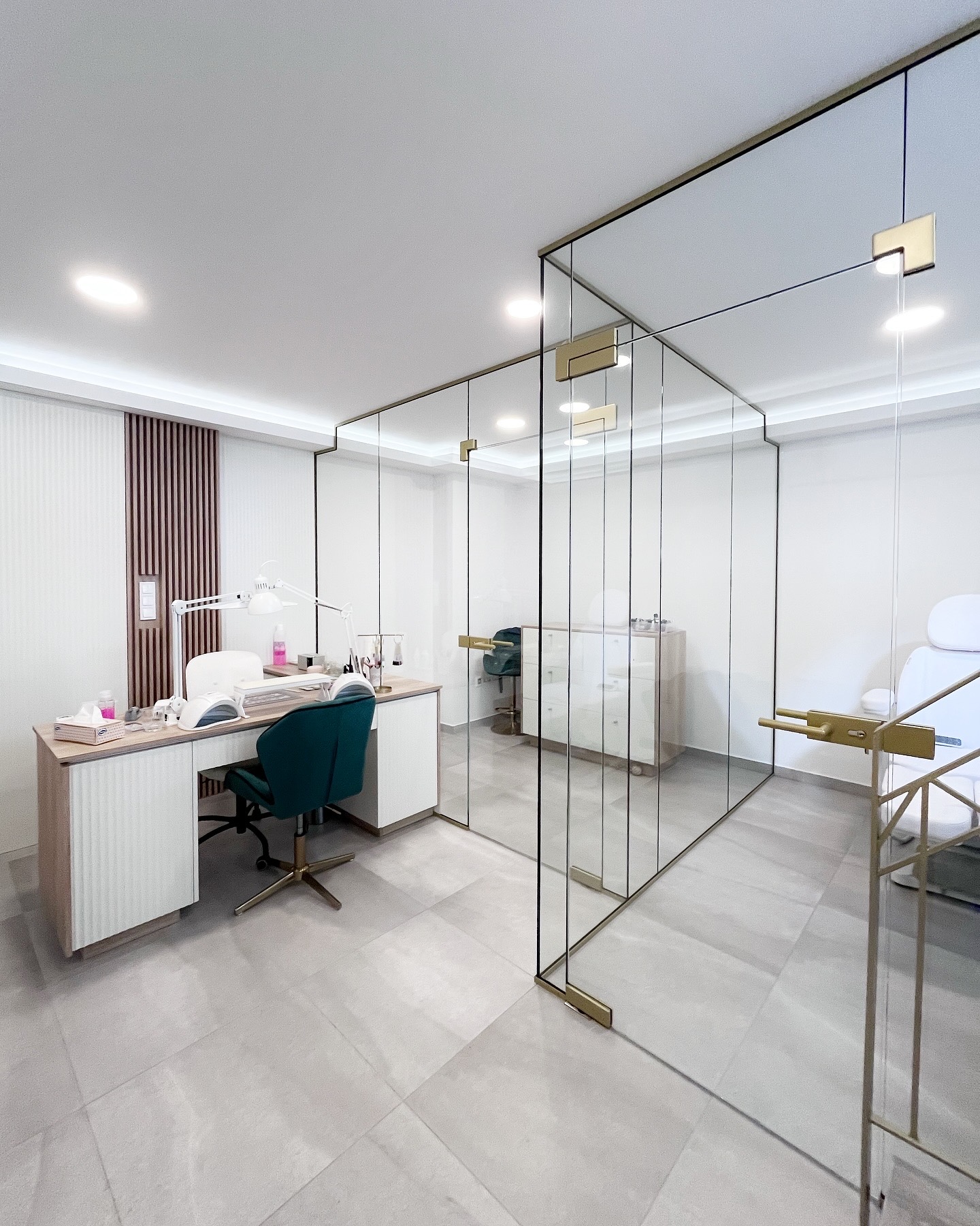 A szépségszalon üvegezésénél a cél az volt, hogy a különböző kezelőhelyiségek jól elkülönüljenek, miközben a tér tágas és világos marad.